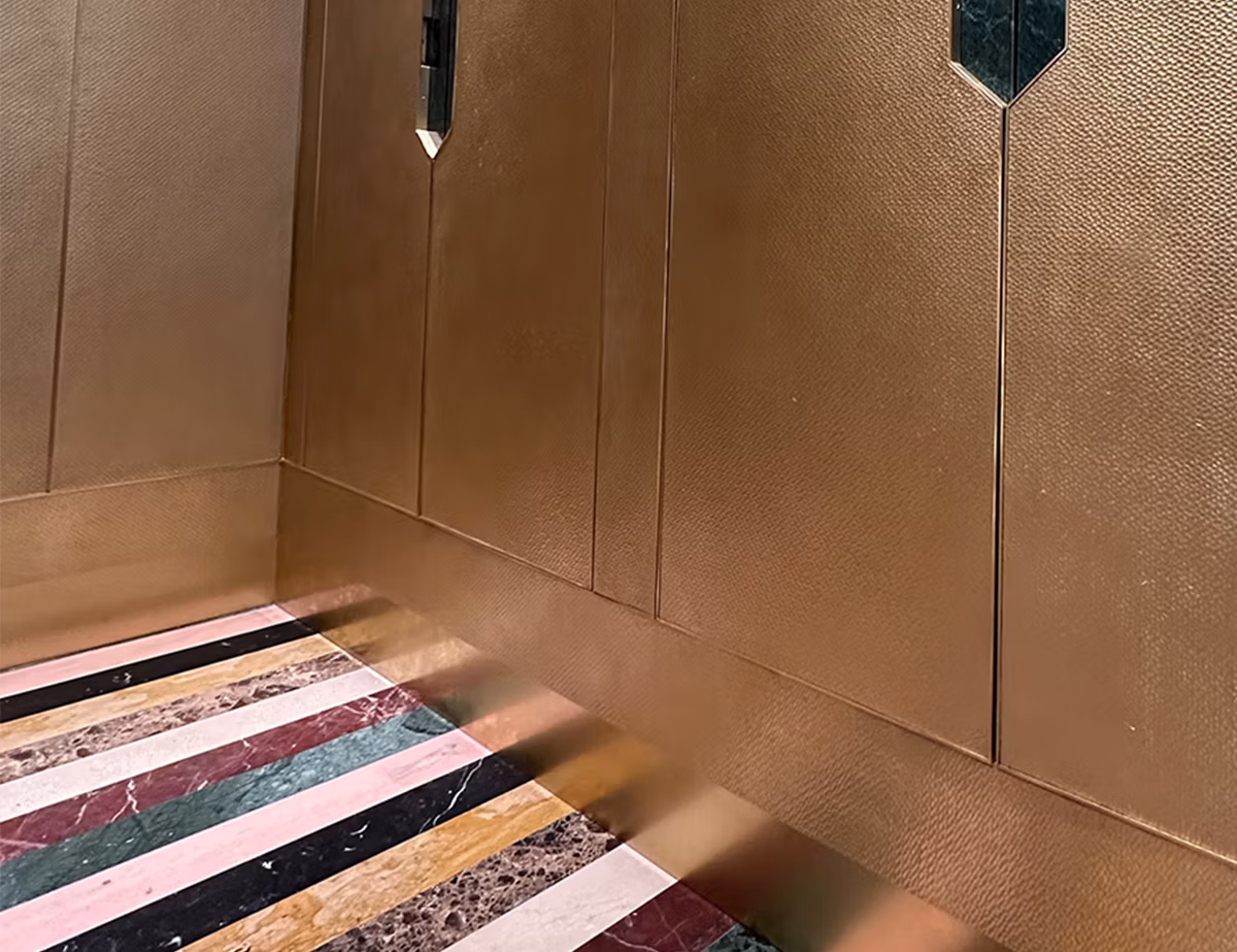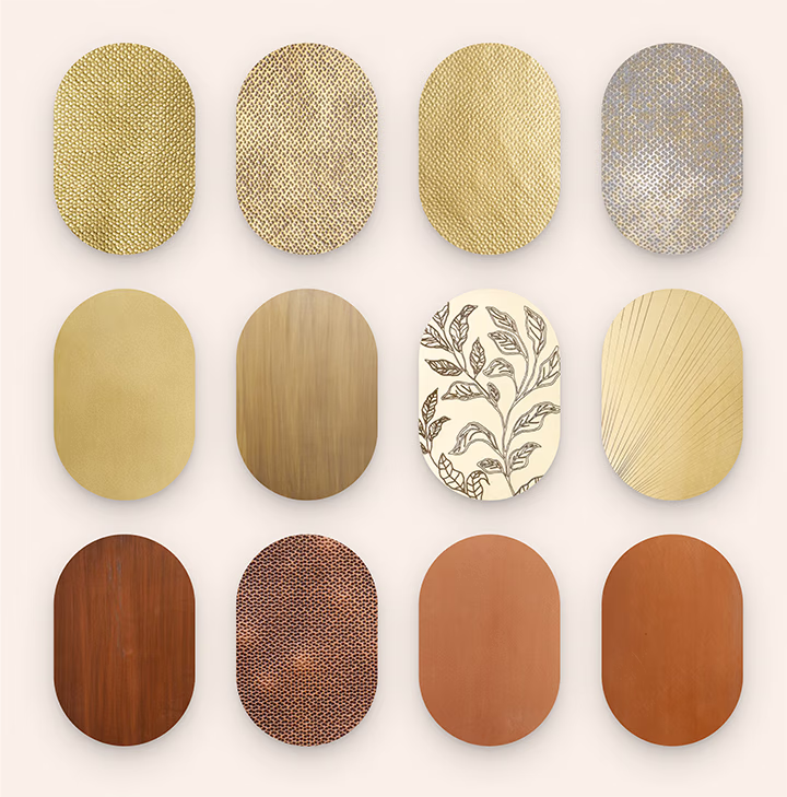 El Martelé es una técnica artesanal francesa desarrollada en el siglo XIX durante el movimiento Art Nouveau que confiere a las piezas una superficie irregular y única. Se utiliza en diseño de interiores por su carácter artesanal, sofisticado y atemporal. Aplicaciones: Paneles de pared o puertas decorativas. Cabeceros de cama.  Columnas y pilares. Detalles para Muebles e iluminación.